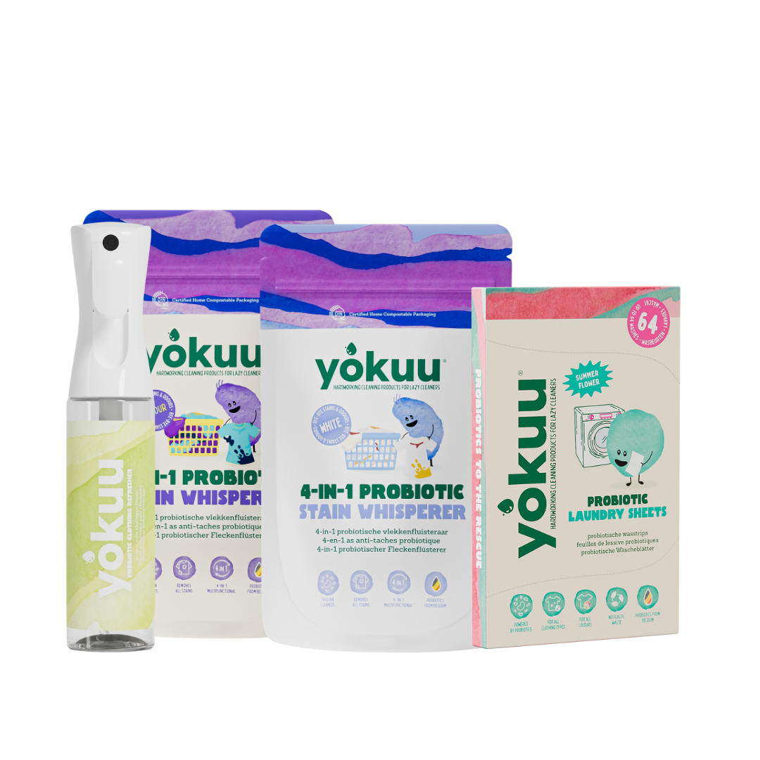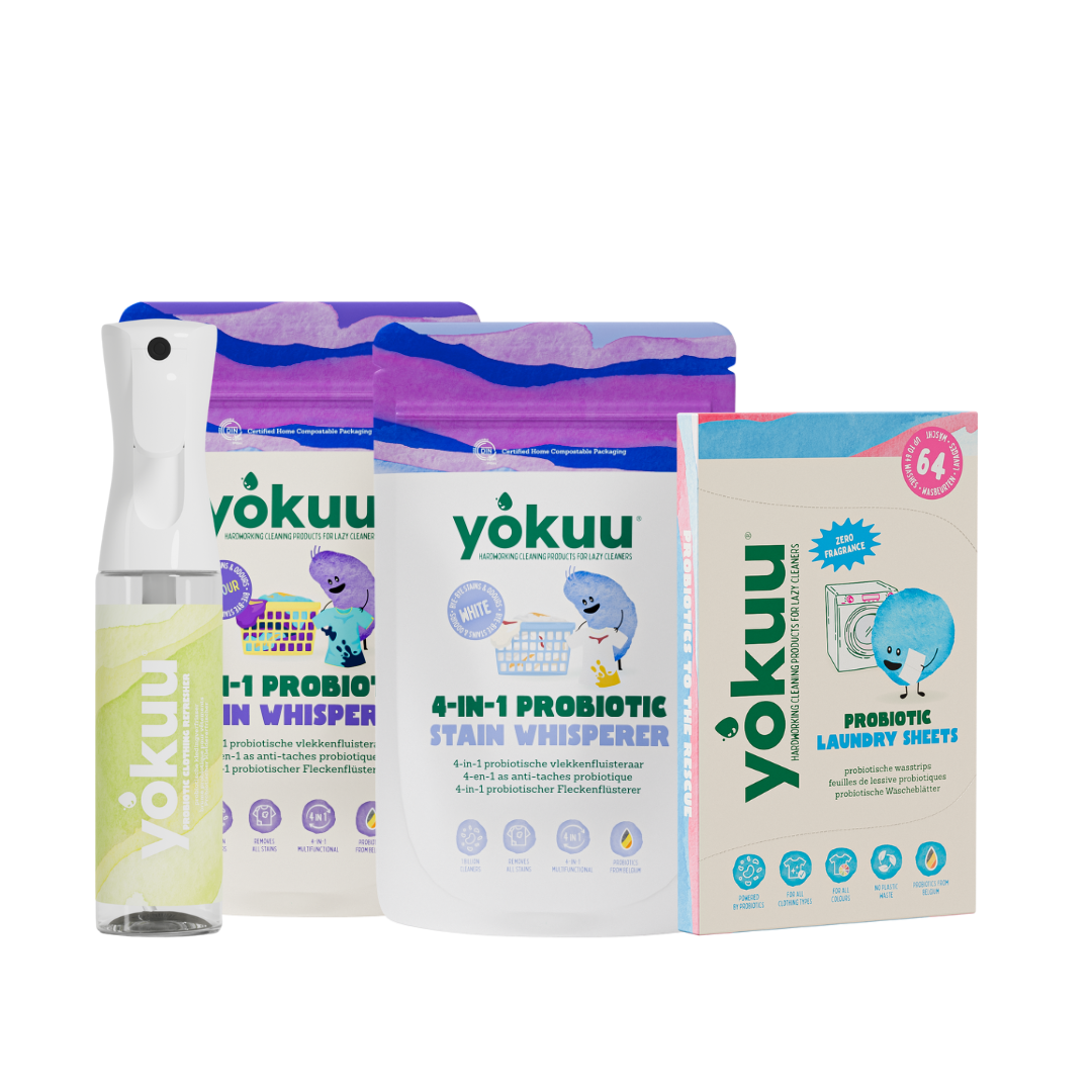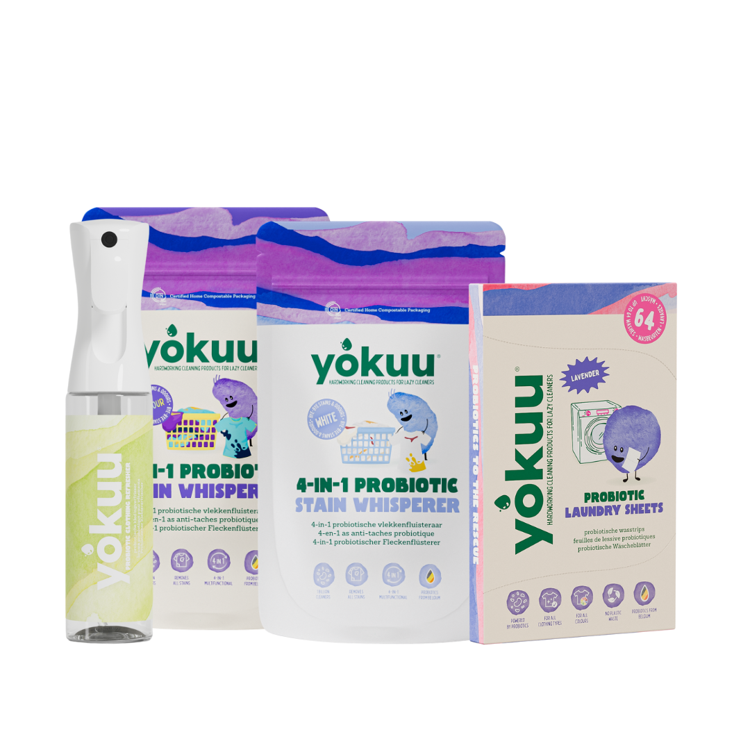 Der Fleckenentferner und die Waschtücher von YOKUU verwenden Probiotika und Enzyme, um Flecken, Schweiß und Gerüche tief in den Fasern zu lösen. Die guten Bakterien reinigen bis zu 7 Tage lang, auch nach dem Waschen.
