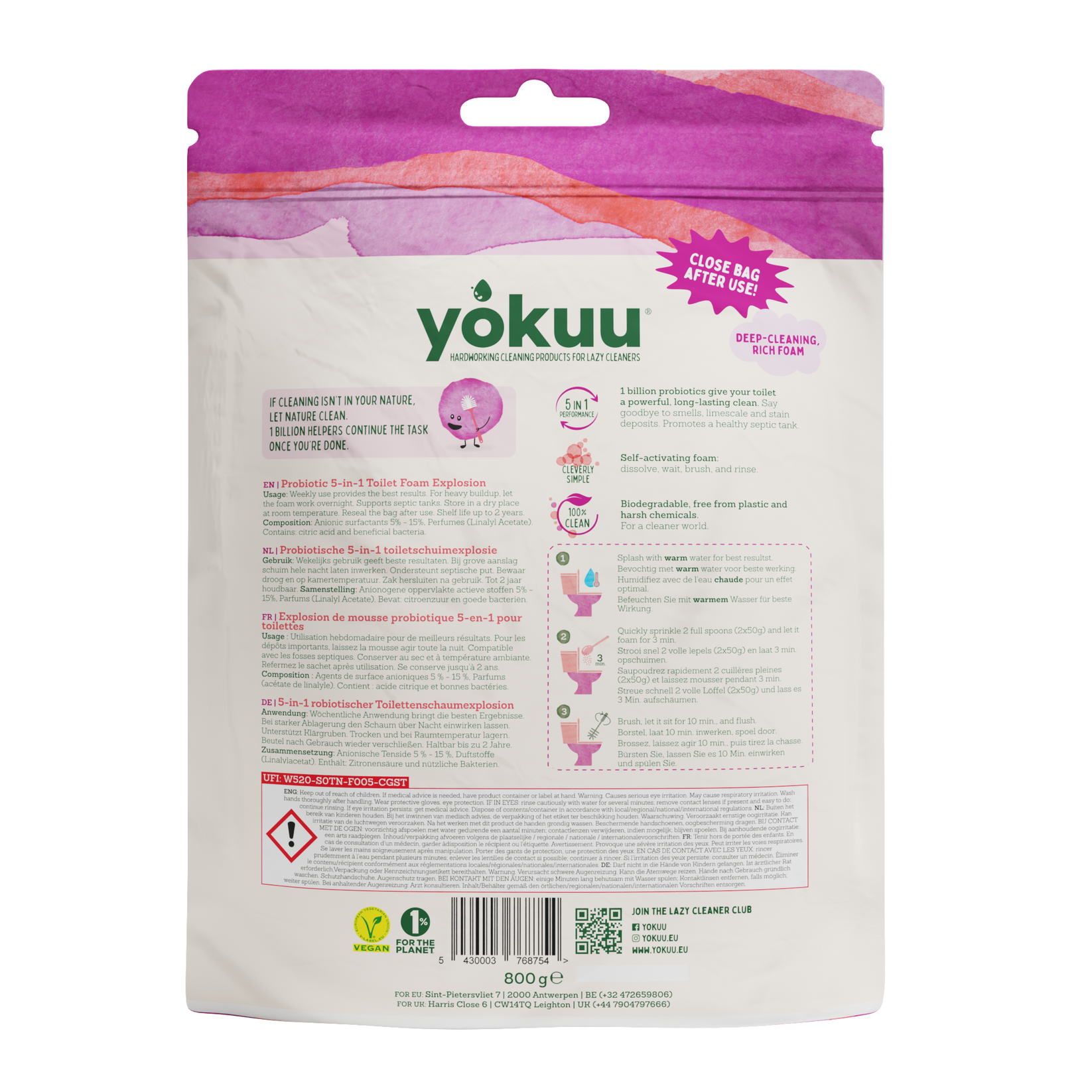 Wir empfehlen, es nicht mit klassischen Reinigern auf Bleich- oder Säurebasis zu mischen, da diese die Probiotika beeinträchtigen können. Alternativ kannst du es mit den Toilettenbomben von YOKUU verwenden: Verwende Foam Explosion einmal pro Woche für eine gründliche Reinigung und Toilet Bombs zwischendurch für eine schnelle Erfrischung.
