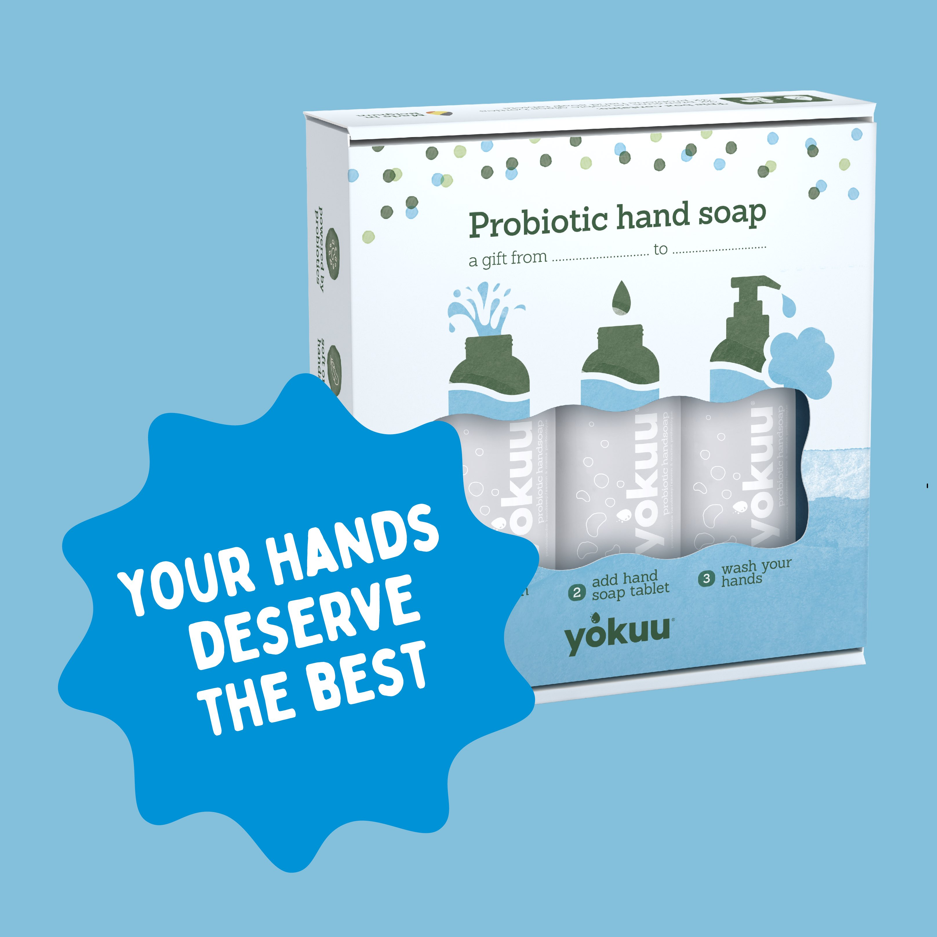 Un savon doux et hydratant pour des mains heureuses. Remplis ton flacon en verre d’eau du robinet, places-y une perle et nourris ta peau avec le savon pour les mains YOKUU. Disponible dans trois parfums uniques.