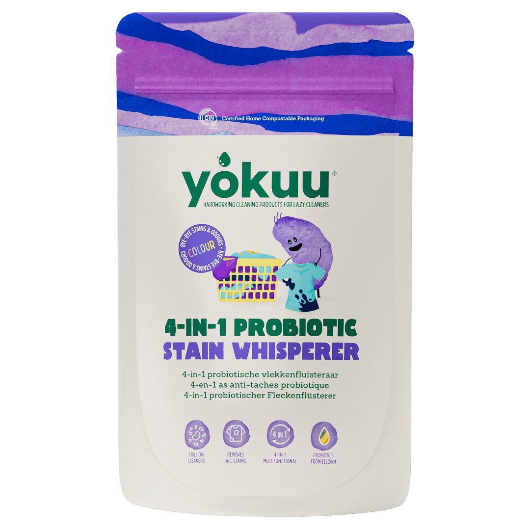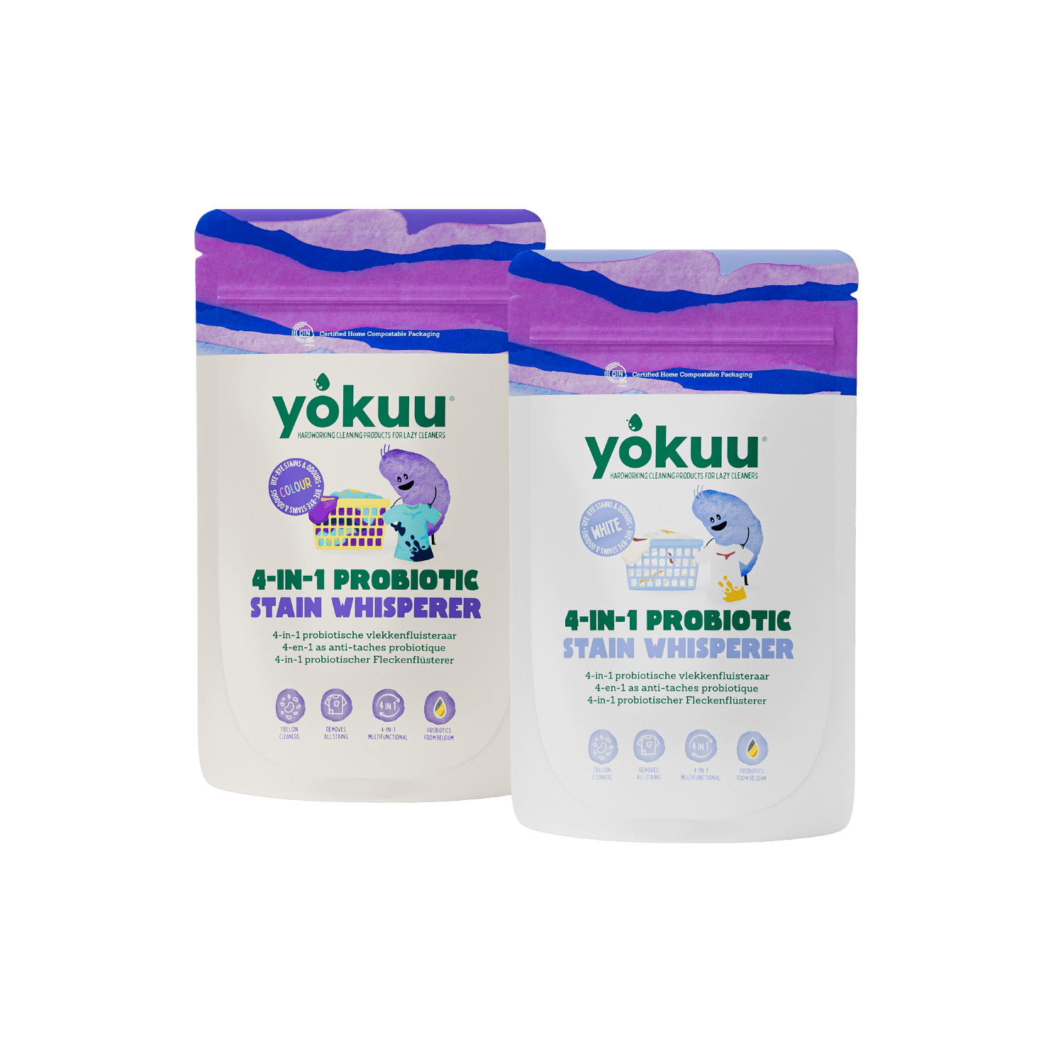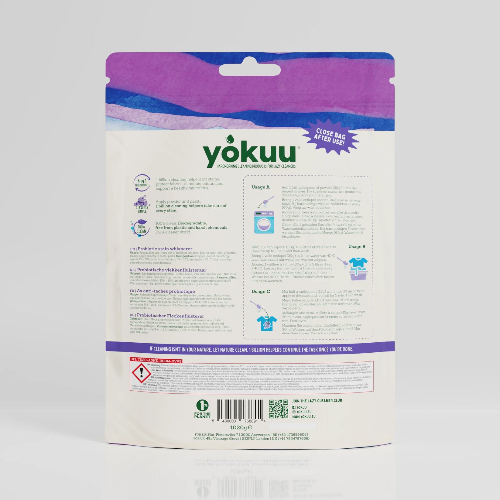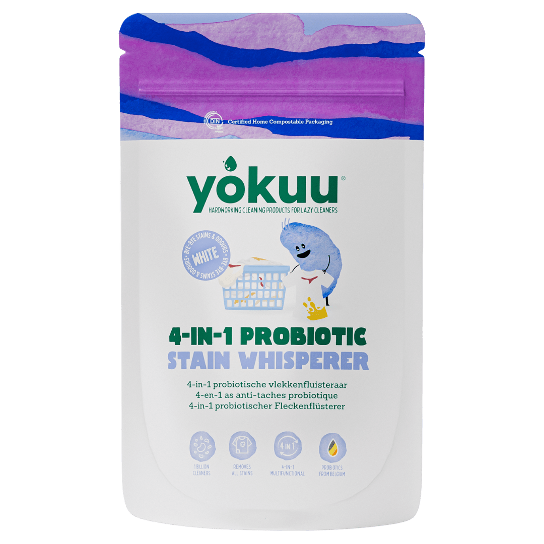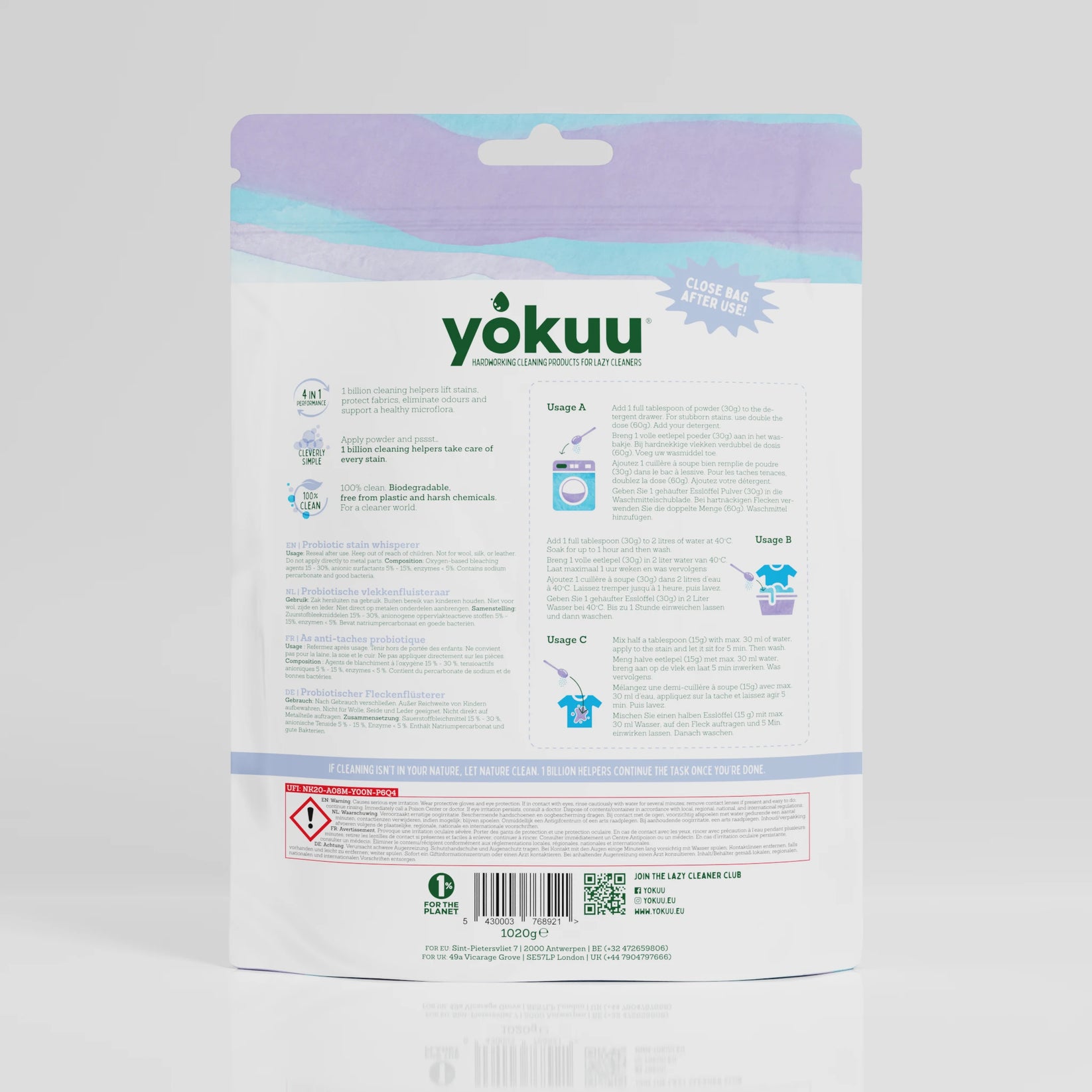 De Vlekkenfluisteraar van YOKUU gebruikt een slimme mix van enzymen en 1 miljard microscopische poetshulpjes – ook wel probiotica genoemd – om zichtbare vlekken en hardnekkige geurtjes te verwijderen. Hij werkt al op lage temperaturen, en blijft zelfs schoonmaken nadat de wasmachine stopt. Zo bouwt hij een gezonde microflora op, in je wasmachine én op je kleren.